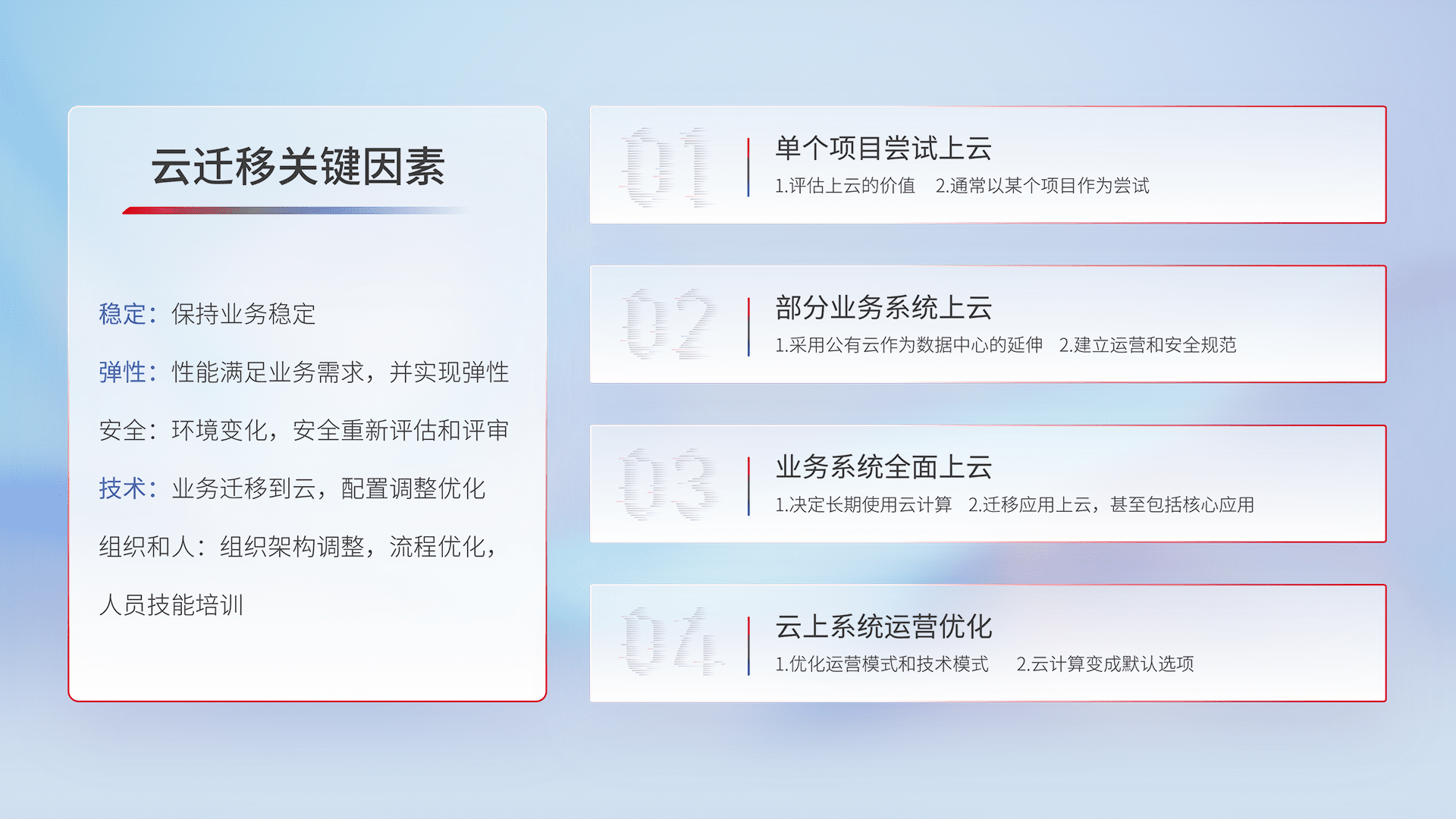 结合实际业务,,从规划设计、、、、云平台选型、、云原生改造、、、数据迁移、、集成交付,,,迁移全过程为客户识别最佳上云路径,,,,做好风险识别管理,,设计网络架构、、、身份权限、、、安全审计合规、、、、操作审计、、、、日志审计、、监控告警策略、、、、多站点容灾设计等,,对云上基础设施进行整体规划,,,,提升IT治理水平,,,以满足弹性、、、高可用、、、、高性能的需求。。。