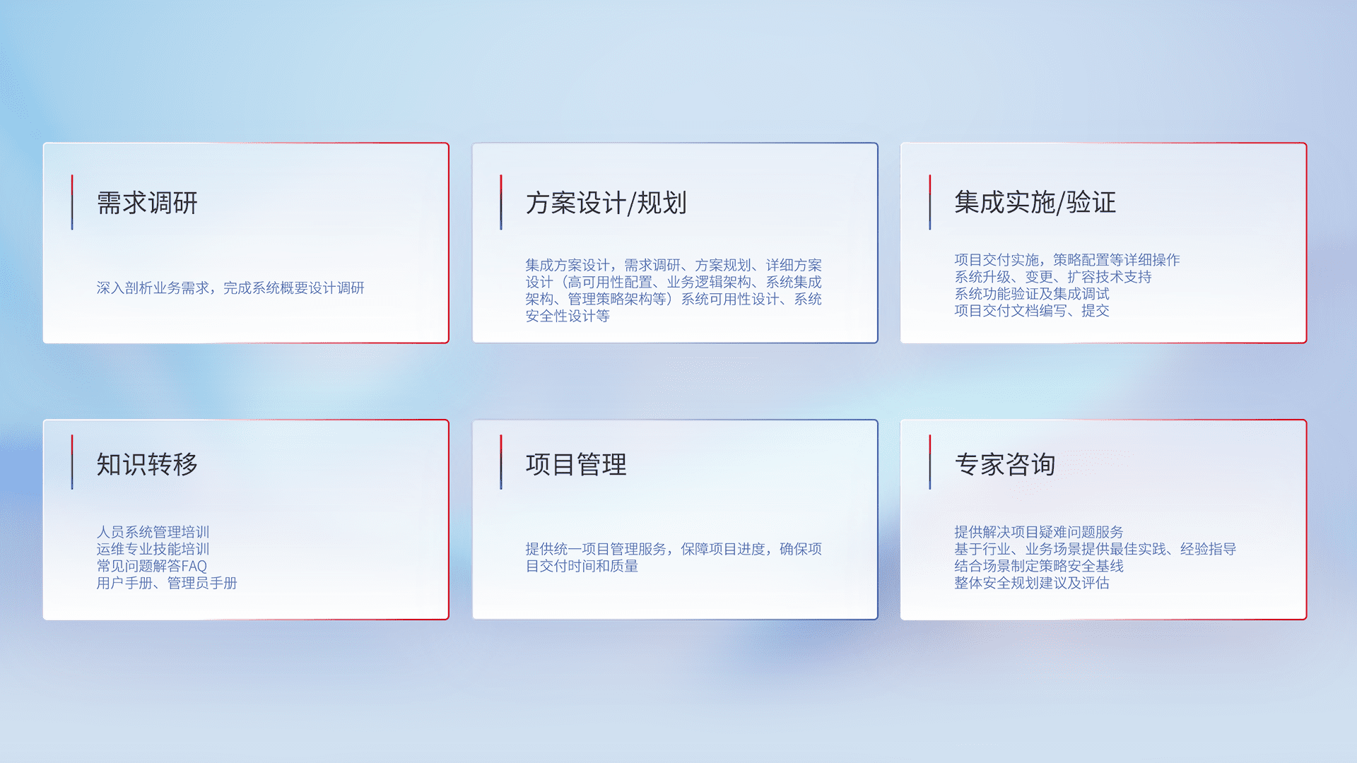 针对客户行业特性,,,将宏观的安全战略和需求,,,,通过专业的交付服务,,实现项目落地,,,为客户提供标准规范的集成交付服务。。