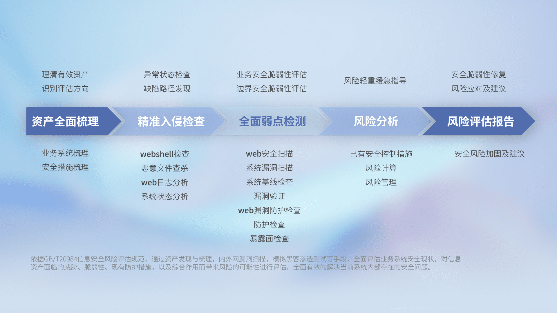 针对客户行业特性,,,,以专业的安全服务+多厂商联合解决方案提供专属的一站式安全管理服务,,,,帮助客户全面感知网络空间威胁,,基于识别、、、检测、、分析、、防护、、、监测、、响应的服务理论模型,,从方案咨询、、、集成交付、、、评估验证、、、优化加固、、、、运维运营,,,,致力于为客户提供完整的闭环管理式安全服务。。。以实战经验为客户打造高抵御风险的安全体系,,,,帮助客户发现威胁、、对抗威胁、、、处置威胁,,,,不断积累安全对抗能力,,,持续保障数字化安全。。。。