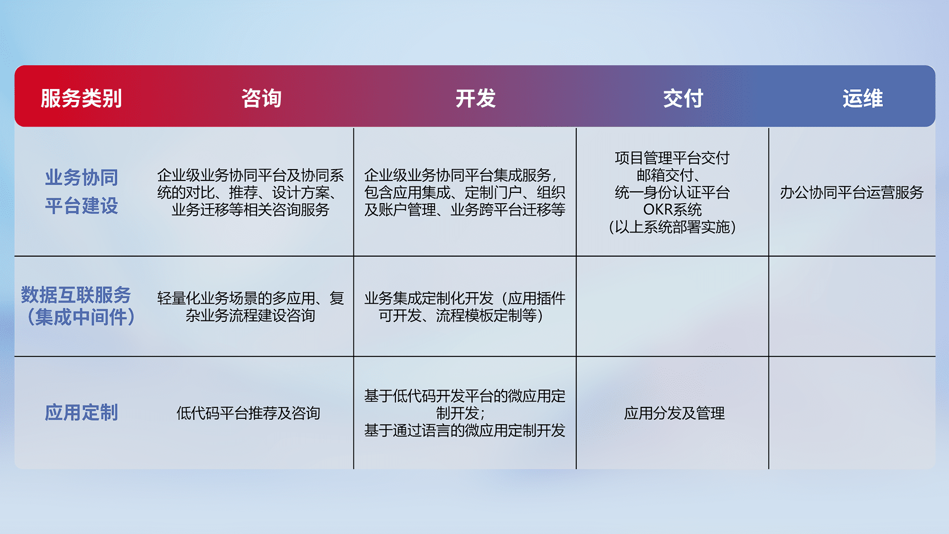 针对钉钉、、企微、、、、IDaas等平台级产品提供产品的规划、、、、方案、、、交付、、、定制化开发等服务,,,,实现如统一协同办公、、、、智能客户服务、、、混合会议管理、、、智能数据查询、、等业务场景,,实现数字化转型。。。